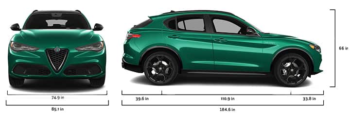 The 2026 Alfa Romeo Stelvio is 184.6 inches long, 74.9 inches wide (not including exterior mirrors) and 66 inches high overall with a maximum cargo volume of 56.5 cubic feet.